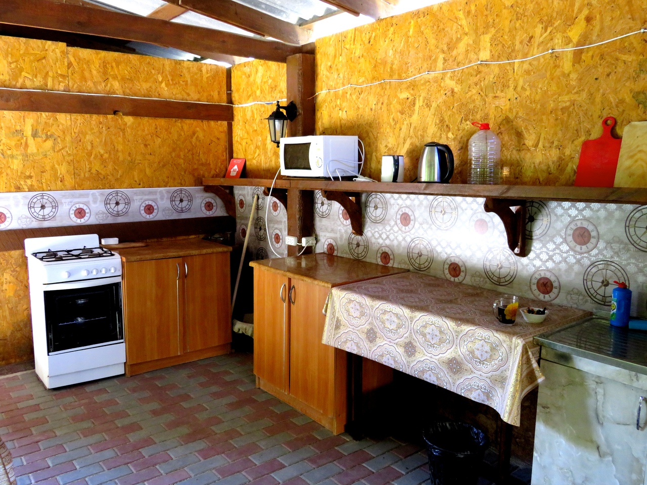 На территории гостиницы находится летняя кухня со всем необходимым для приготовления пищи, многоместная парковка, место для приготовления шашлыка. Для каждого номера предоставляется посуда - чашки, вилки-ложки-тарелки.